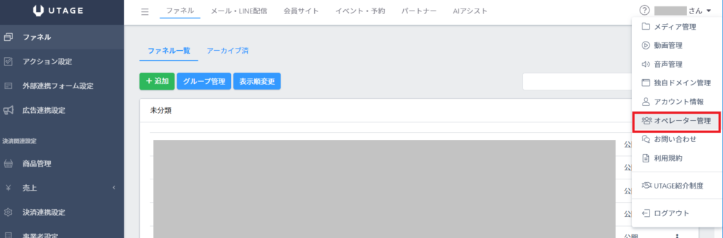 2.画面右上のアカウント名をクリックし、表示されるメニューから【オペレーター管理】をクリックします。