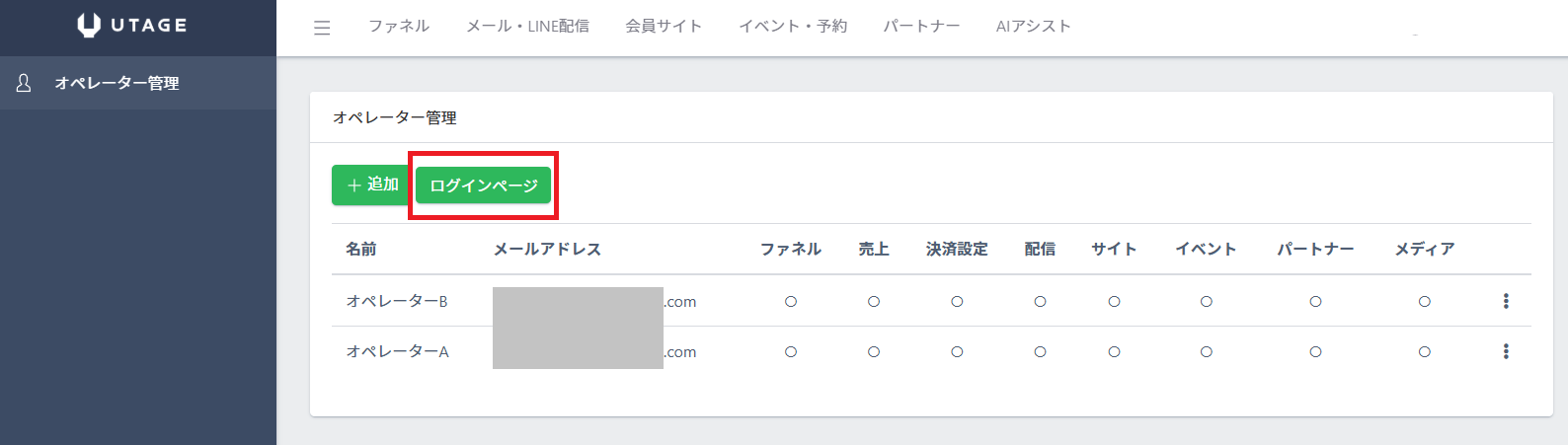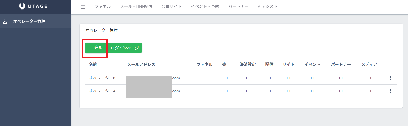 まず、UTAGE契約アカウント(管理者アカウント)でログインし、作業担当者用のオペレーターアカウントを追加します。