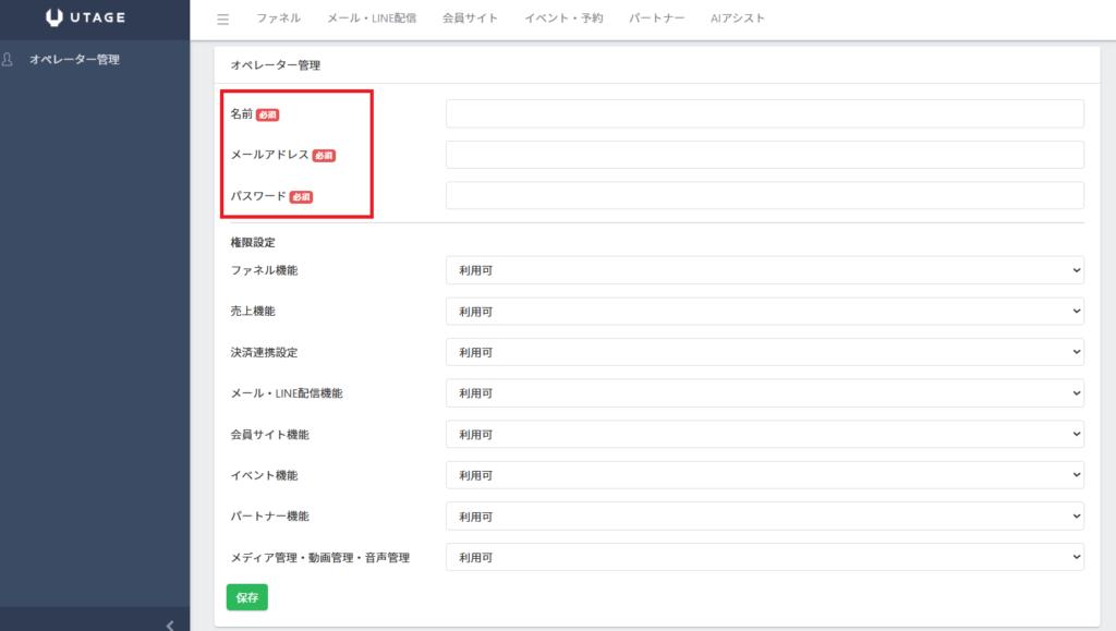 - 「オペレーター管理」メニューはUTAGE契約アカウントでのみ操作できます。オペレーターアカウントでログインした場合は「オペレーター管理」メニューは表示されません。オペレーターの追加・編集・削除は、すべて契約アカウントから行ってください。