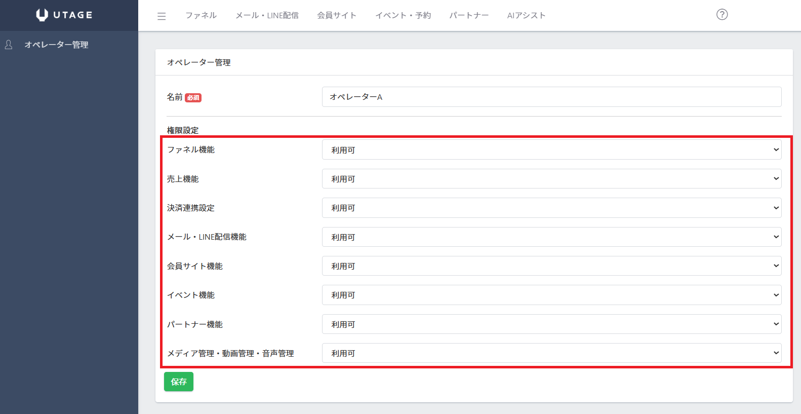 オペレーターアカウントを追加したら、各機能へのアクセス権限を設定します。機能ごとに「利用可」「利用不可」を選択できます。