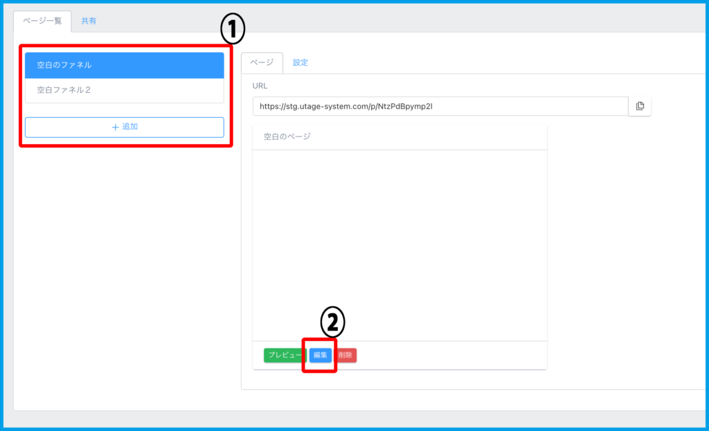 【ファネル】>「ファネル一覧」該当ファネル >「ページ一覧」該当ページ >【編集】 をクリックして編集画面を開きます。
