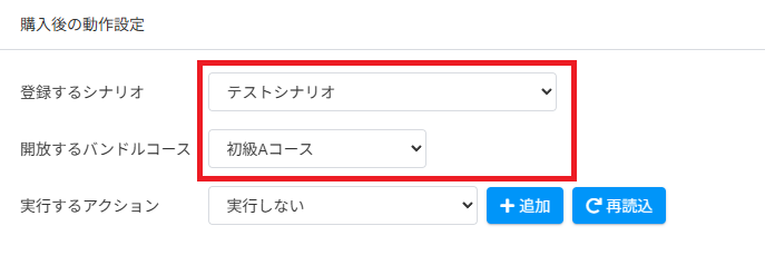 A. 商品詳細の「購入後に開放するバンドルコース」と「購入後のアクション」の
