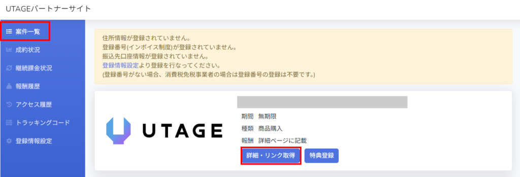 2.「案件一覧」をクリック後、取得したいアフィリエイトリンクの