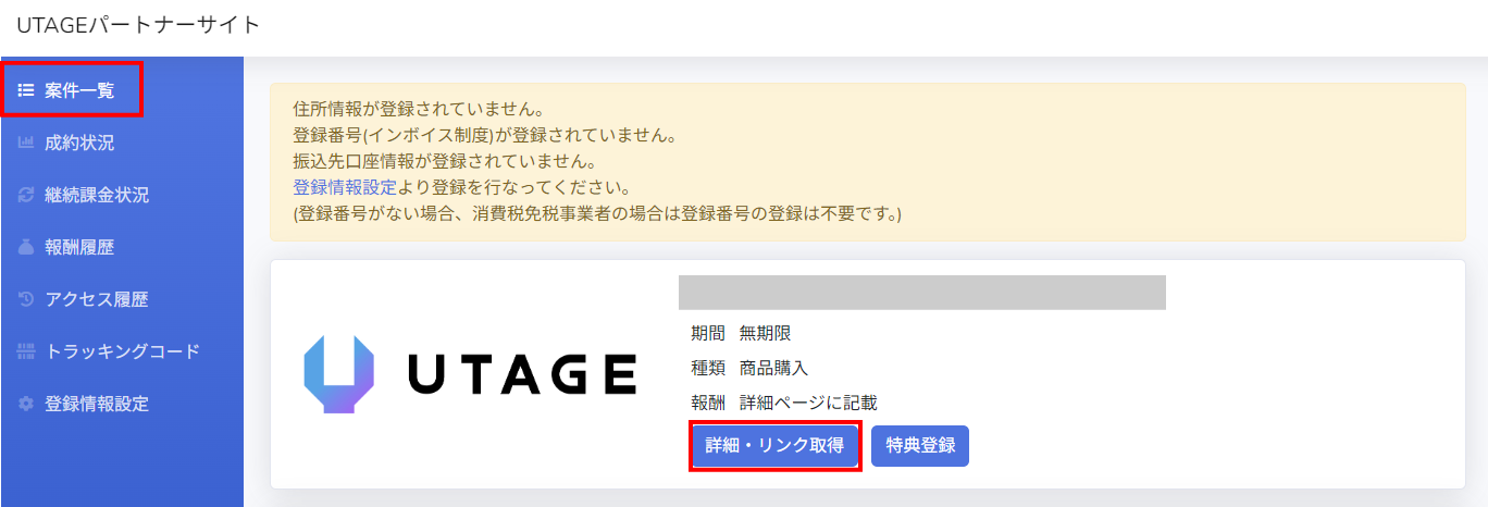 1.「UTAGEパートナーサイト」にログインします。