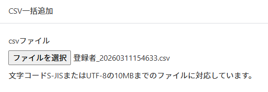 「CSV一括追加」【ファイルを選択】をクリックし、ポップアップウィンドウにて追加するCSVファイルを選択します。