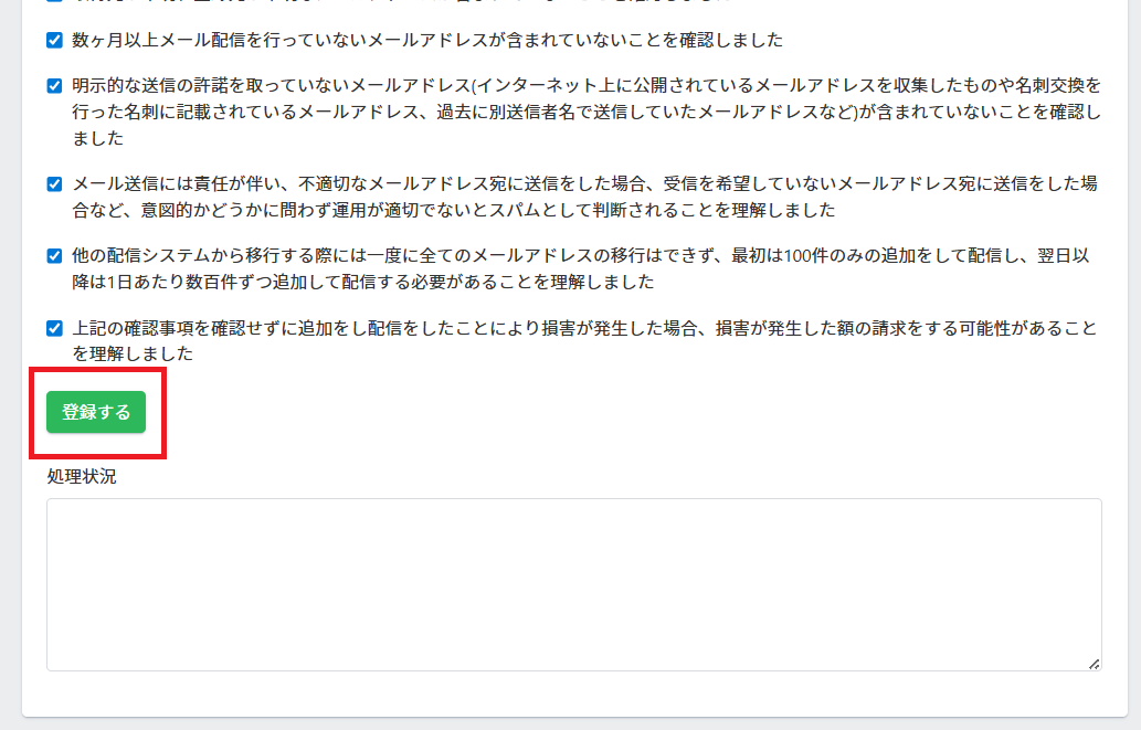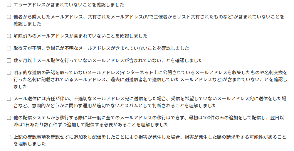 ※ランディングページや販売ページ、申し込みページ、登録ページなど受信者が意図的に入力して取得したメールアドレスのうち解除していないもののみ登録をしてください。