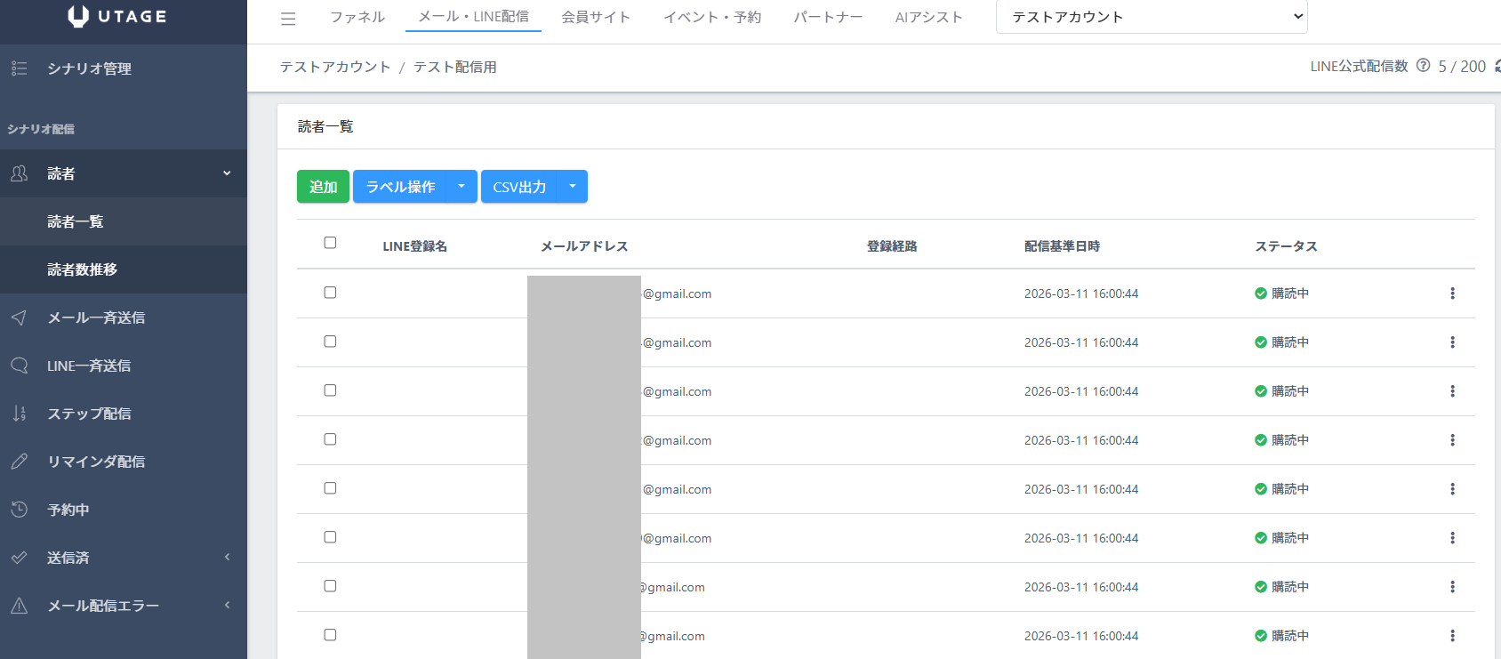1.メール・LINE配信 > アカウント名選択 > シナリオ名選択 > 読者一覧 > 【追加】ボタン押下