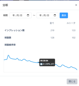 分析画面では、【インプレッション数】【視聴数】【視聴維持率】を確認できます。