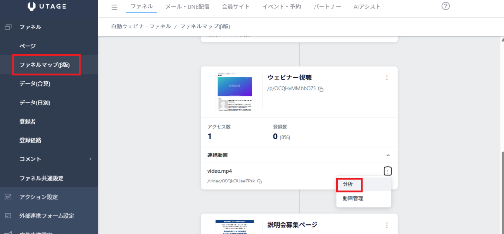 3.動画を設置しているページの「連携動画」の︙メニューより【分析】 をクリックします。