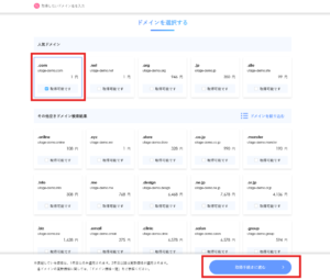1. 【ドメインを選択する】のエリアで、取得するドメインの末尾(トップレベルドメイン)を選びます。「.com」「.net」「.jp」など複数の選択肢がありますので、取得したいドメインにチェックを入れ、画面下部の【取得手続きに進む】をクリックします。