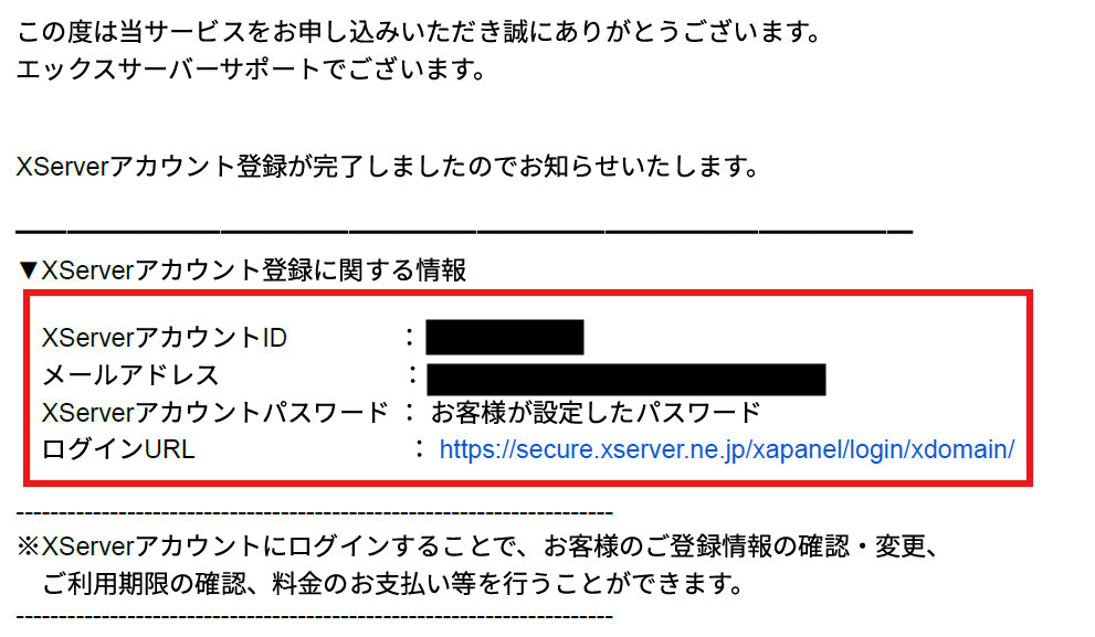 1. 登録したメールアドレス宛に「【XServerドメイン】■重要■ XServerアカウント登録完了のお知らせ」というメールが届きます。このメールにはXServerアカウントIDログインURLが記載されていますので、大切に保管してください。
