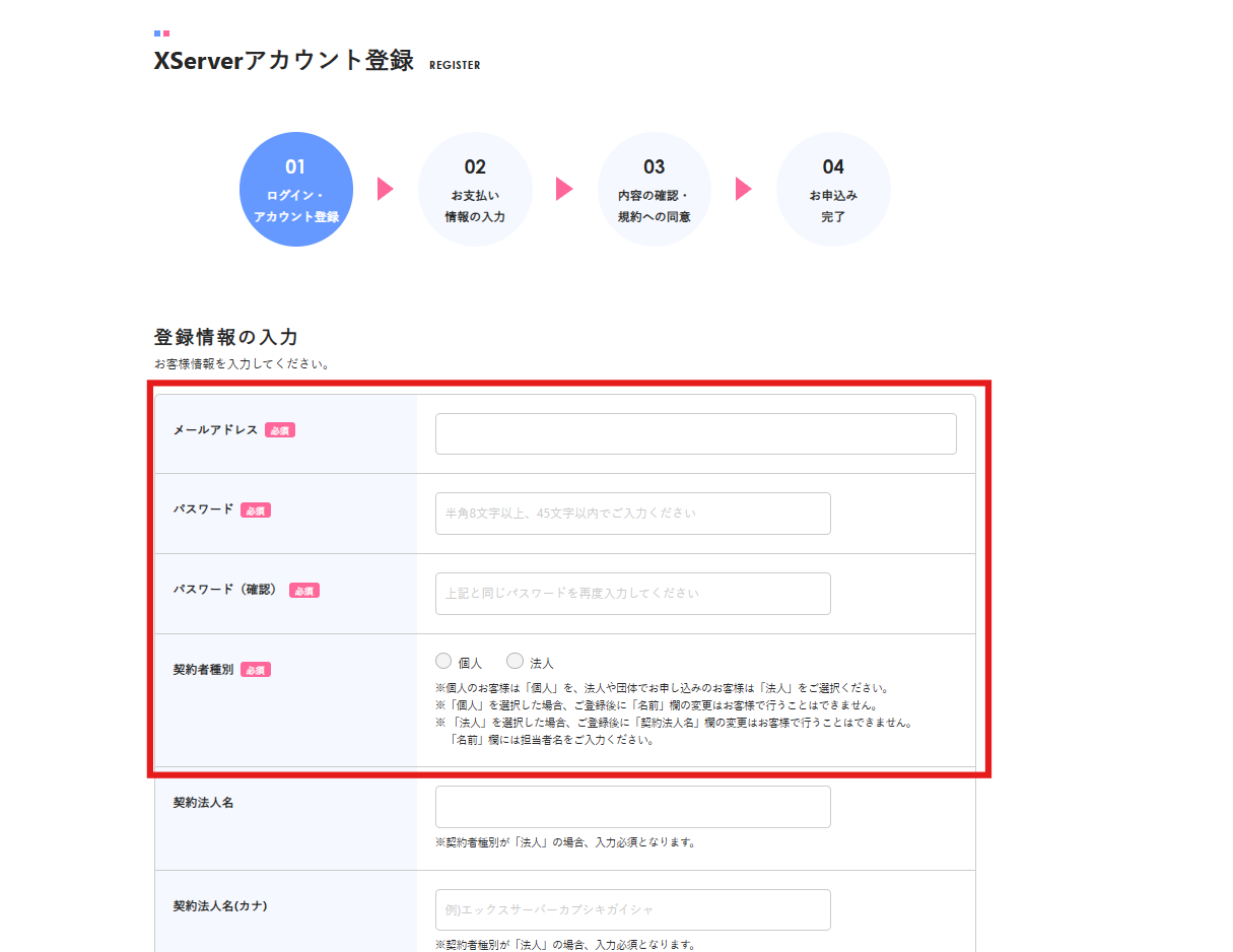 1. 【XServerアカウント登録】画面で、以下の登録情報を入力します。