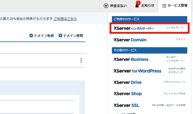 2. XServerドメインの管理画面が開きます。画面右上の【サービス管理】をクリックします。