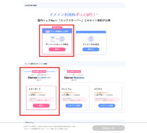 1. 【セットで契約するサーバーの選択】で、「XServerレンタルサーバーセット」「スタンダード」プランを選択します。メールアドレスの作成が目的であればスタンダードで十分です。