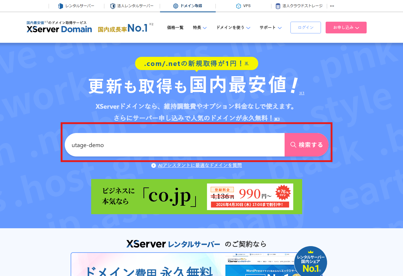 エックスサーバードメイン公式サイト