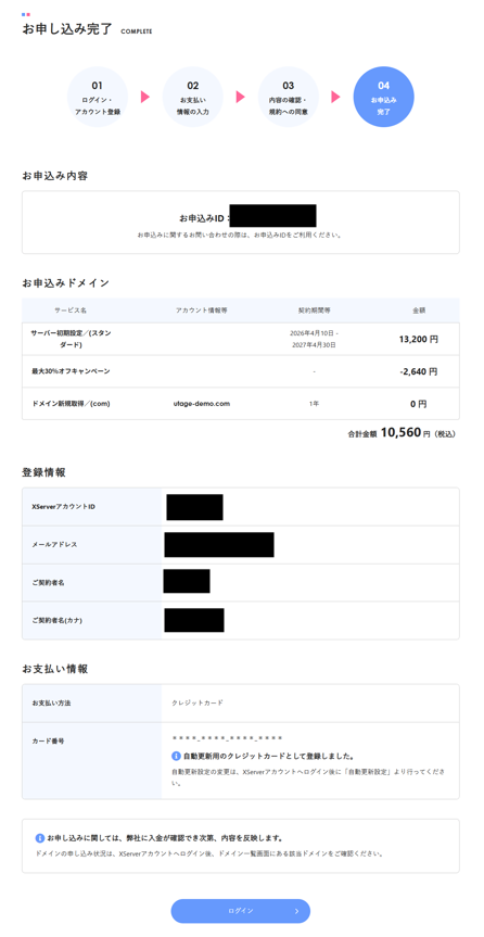 1. 【お申し込み完了】画面が表示されれば、ドメインの取得とサーバーの契約が完了です。