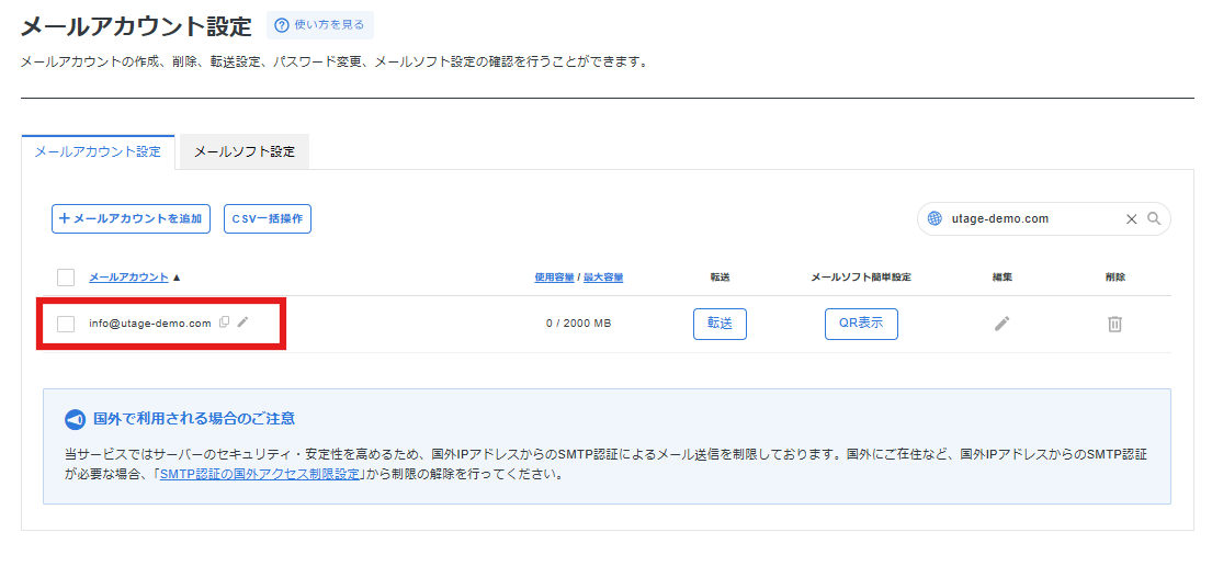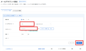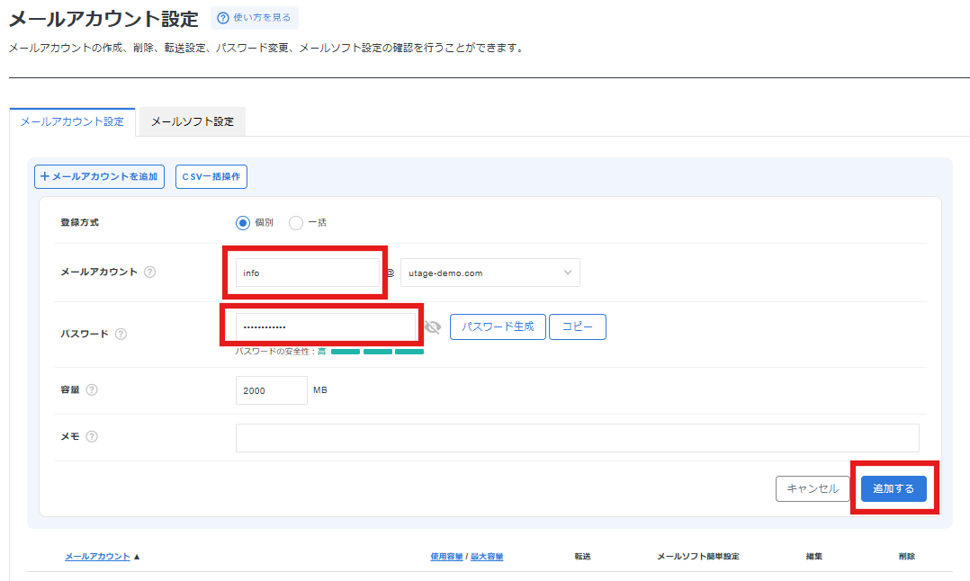 ⚠ 注意:ここで設定した「メールアカウント名」と「パスワード」は、この後の転送設定やUTAGEでの設定で使用します。メモを取って保管しておいてください。