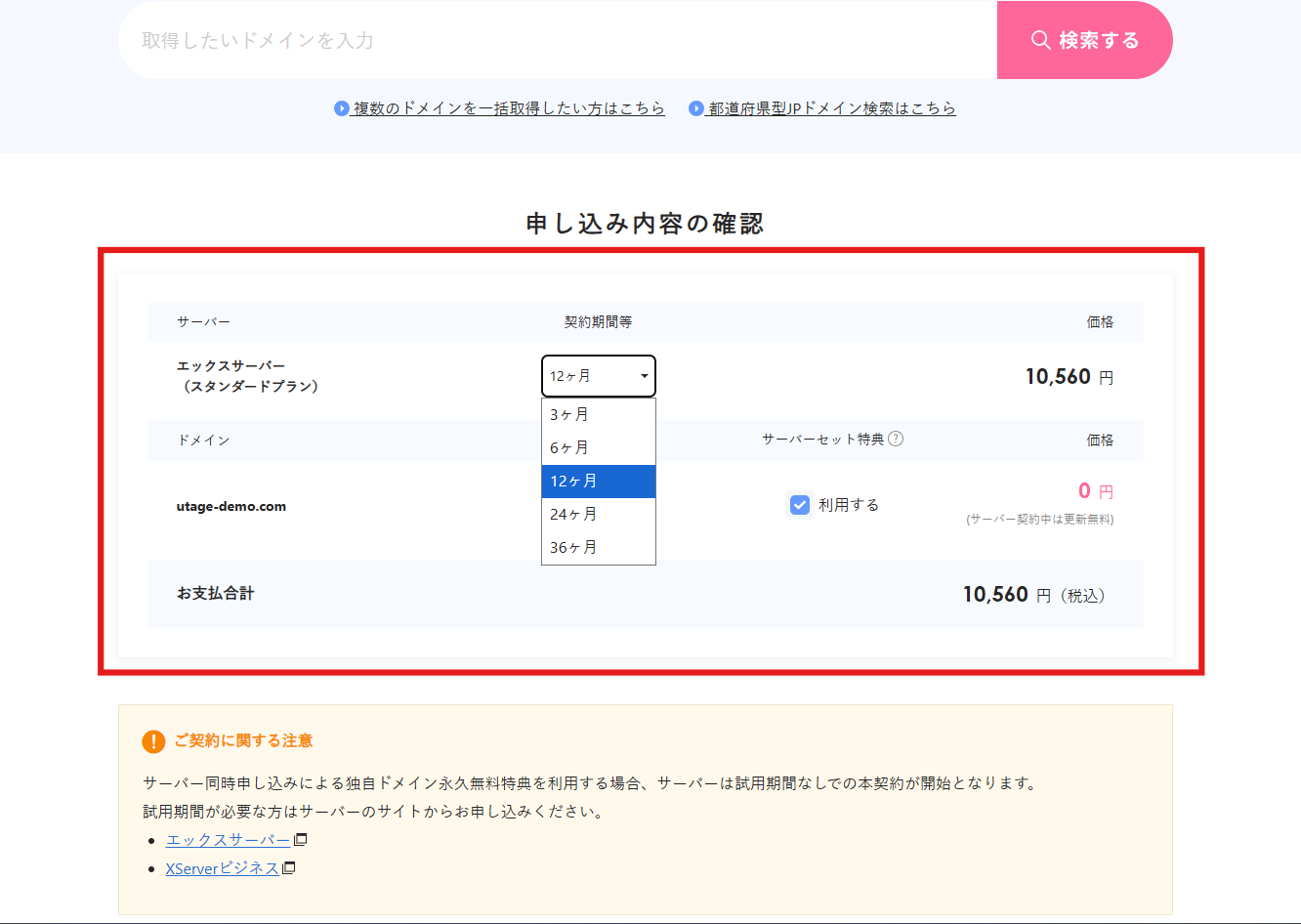 • サーバーセット特典:契約期間を12ヶ月以上に設定すると、サーバーセット特典が利用できます。「利用する」にチェックが入っていることを確認してください。この特典を利用すると、ドメインの取得・更新費用が0円(無料)になります。
