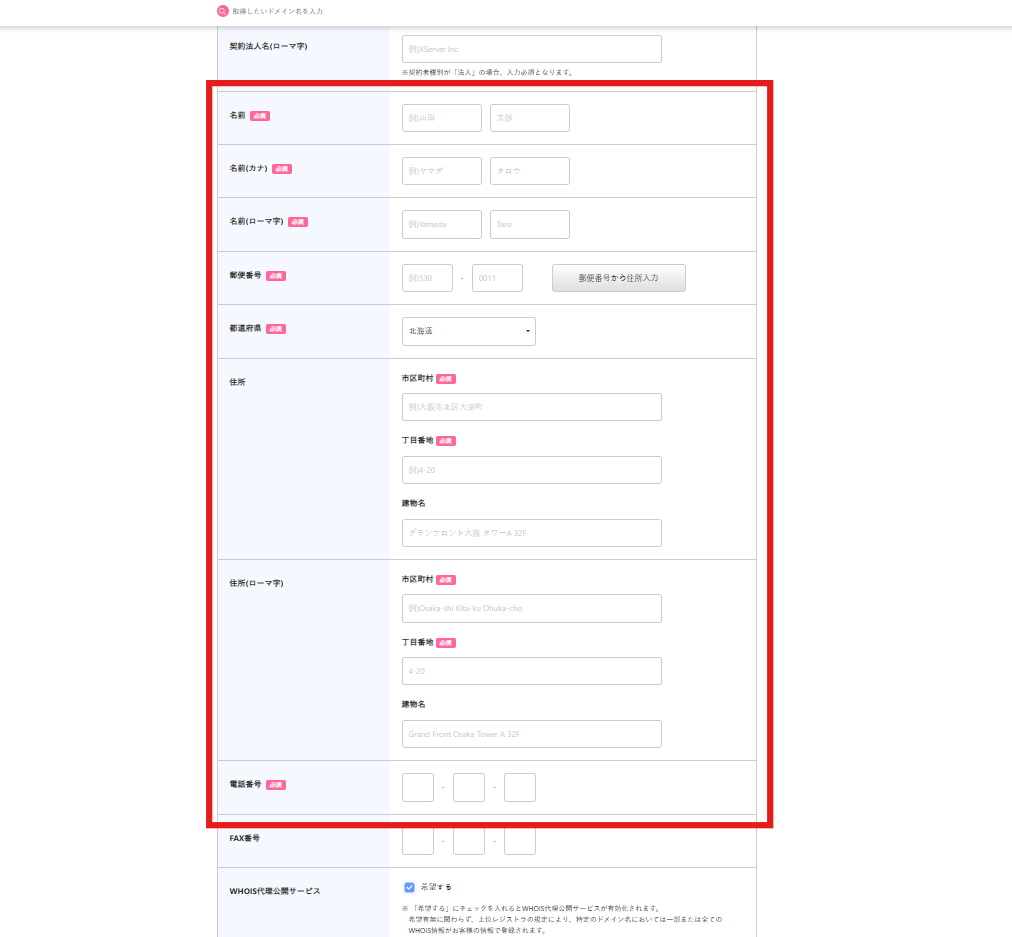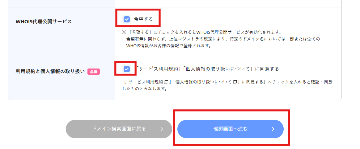 • 【「WHOIS代理公開サービス」を希望する】:チェックを入れることを推奨します。このサービスを有効にすると、WHOIS検索で公開されるドメインの所有者情報をXServer名義で代理公開できます。無効にした場合、ご自身の登録情報がWHOIS検索で公開されてしまいます。