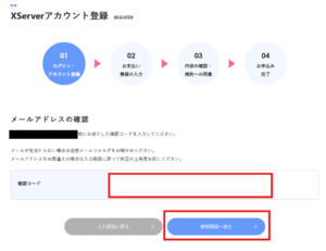 1. 【メールアドレスの確認】画面が表示されます。登録したメールアドレス宛に確認コードが届きますので、メールに記載された確認コードを入力し、【確認画面へ進む】をクリックします。