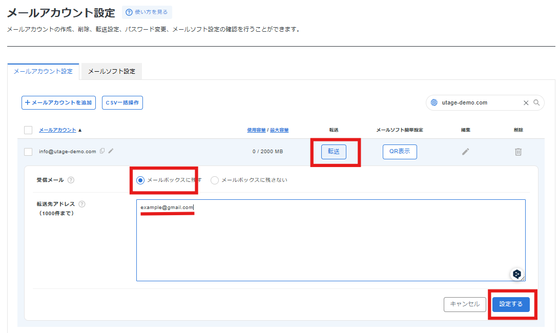1. STEP3のメールアカウント一覧画面で、作成したメールアドレスの【転送】をクリックします。