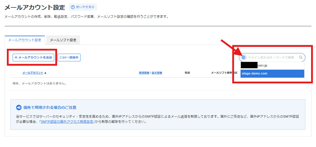 2. 対象のドメインが選択された状態で、【+メールアカウントを追加】をクリックします。