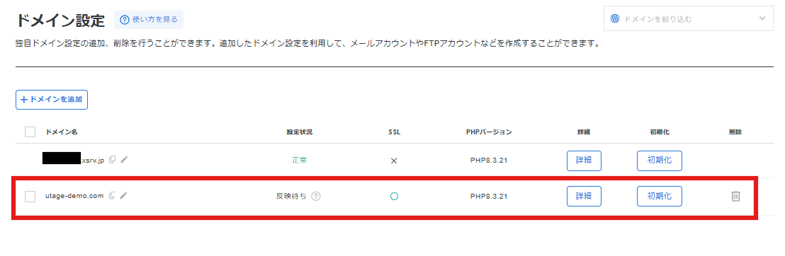 1. ドメイン設定一覧に、追加したドメインが表示されれば設定完了です。