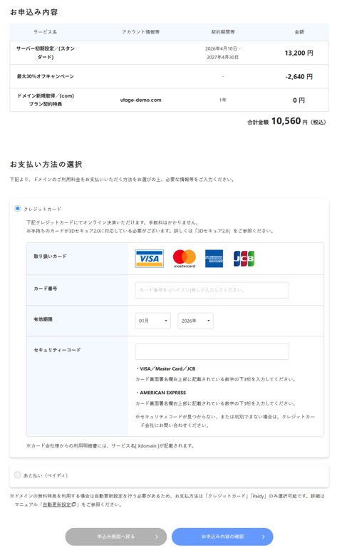 • お支払合計:サーバー料金とドメイン料金の合計が表示されます。内容に間違いがないか確認してください。