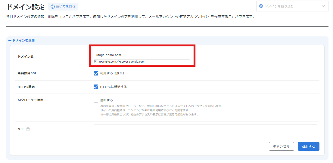 1. 【+ドメインを追加】をクリックします。