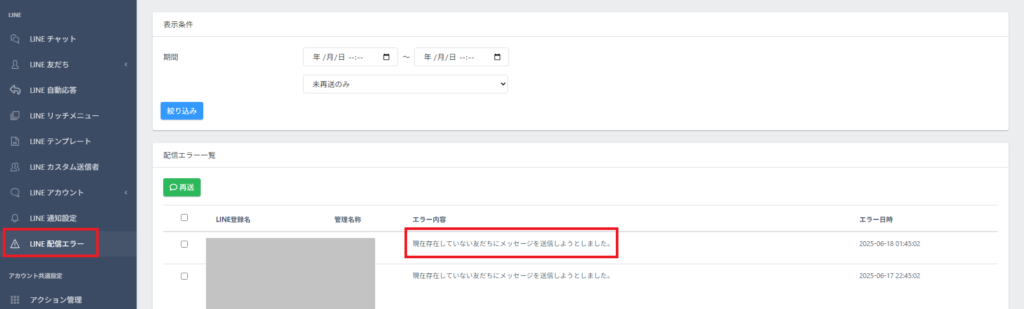 ※メール・LINE配信 > アカウント > 左側メニュー「LINE配信エラー」