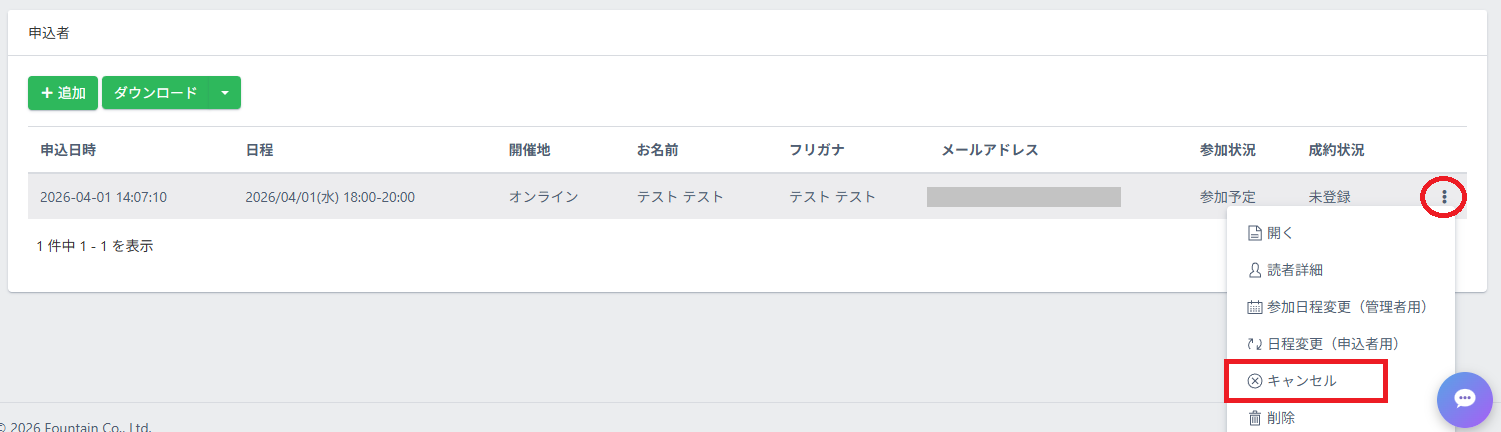該当申込者の【︙】>【キャンセル】をクリックするとキャンセル処理のポップアップが表示されます。