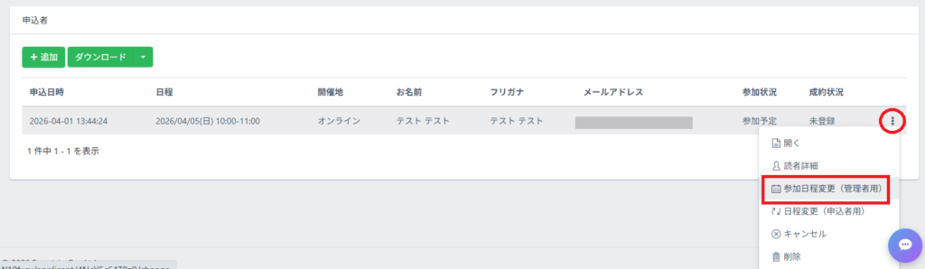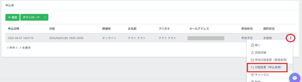 1.「申込者」一覧より該当ユーザーの【︙】>【参加日程変更(管理者用)】をクリック