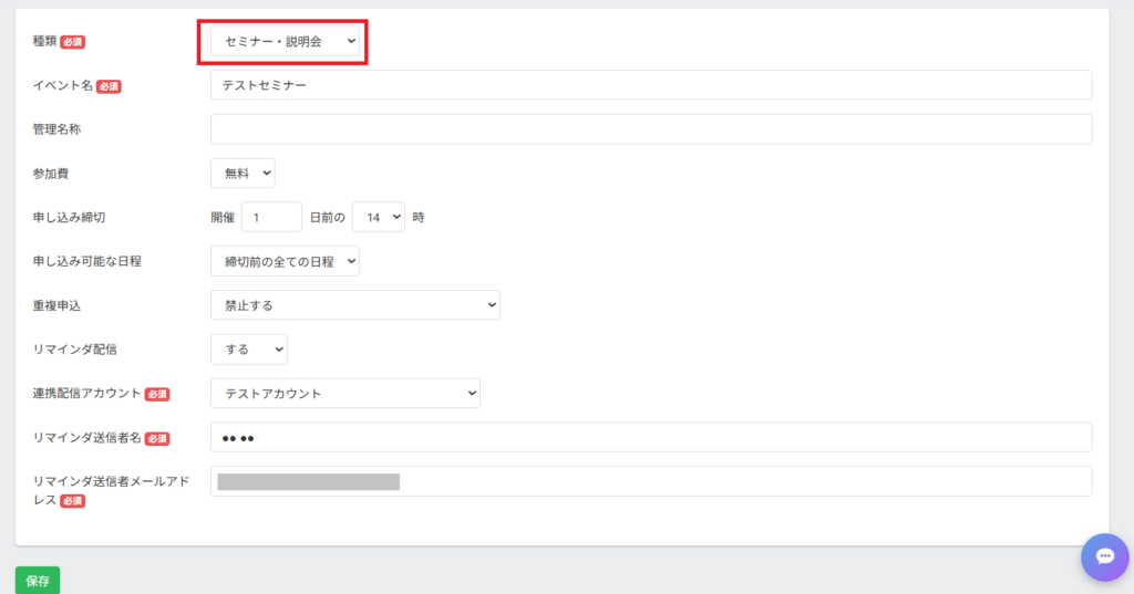 2.種類【セミナー・説明会】を選択し、イベントの内容を入力して保存