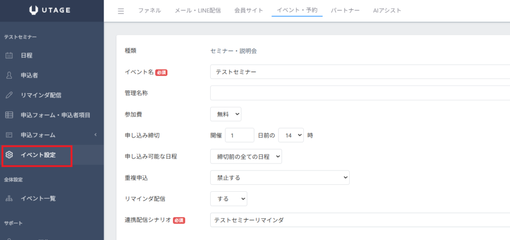 作成した内容の確認・変更やイベントに関する設定を行うことができます。