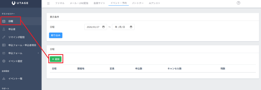 左メニュー【日程】>【+追加】からイベントの開催日程を追加します。