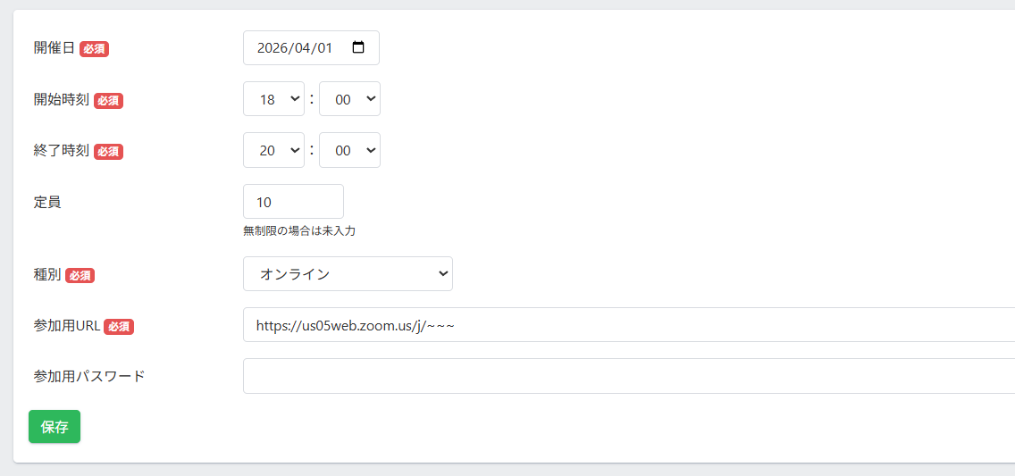 ※Zoom開催の場合は、招待リンク(https://*******.zoom.us/j〜)を設定してください。