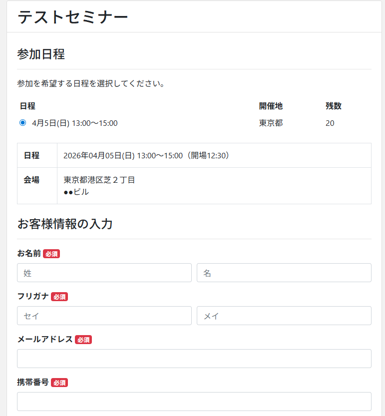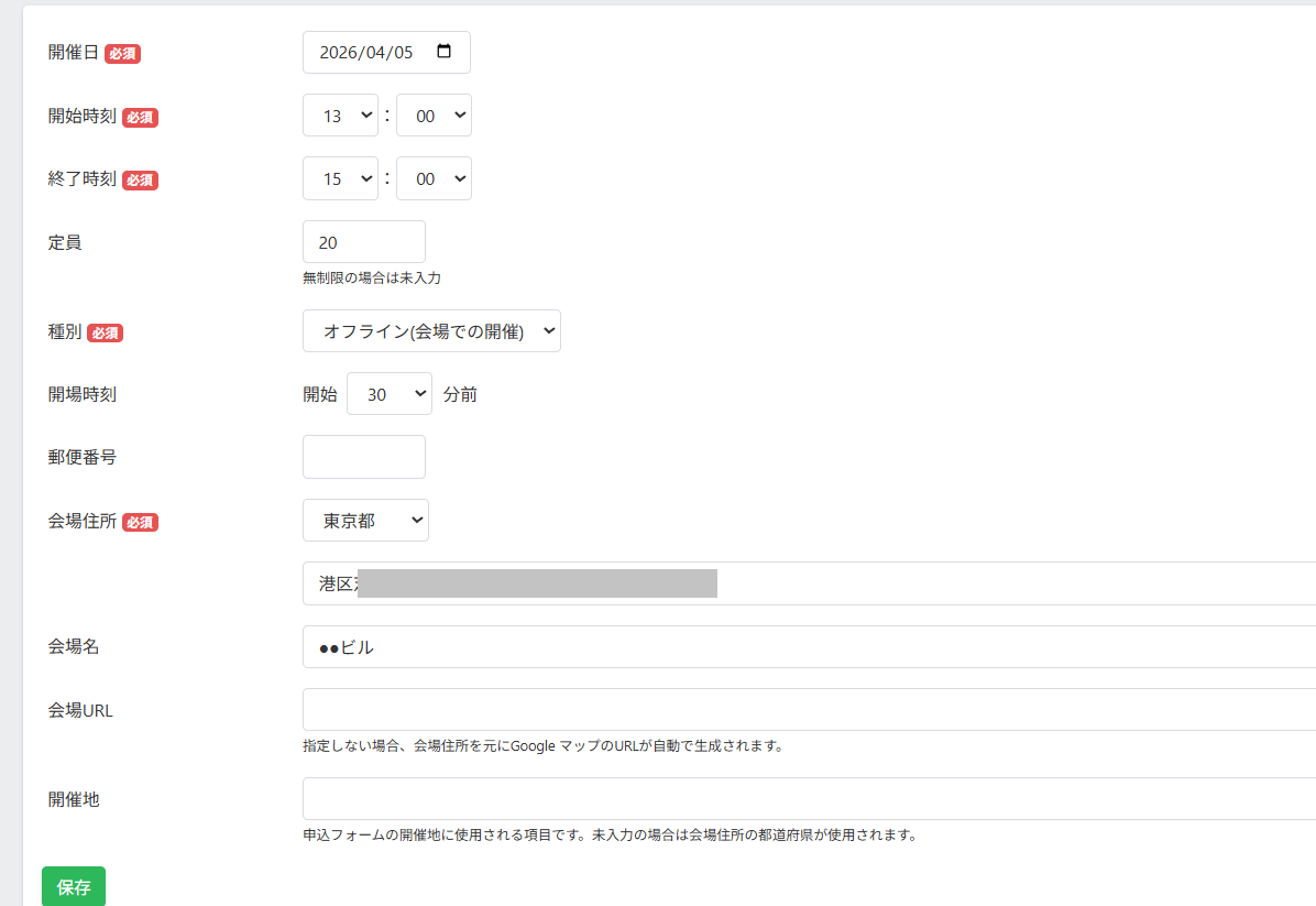 申込フォームの「開催地」に使用される項目です。未入力の場合は会場住所の都道府県が使用されます。