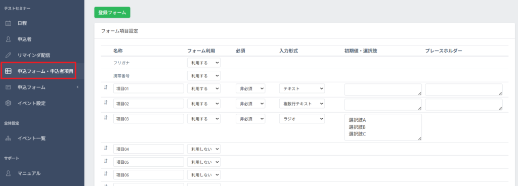 左メニュー【申込フォーム・申込者項目】より、フォーム項目設定が可能です。