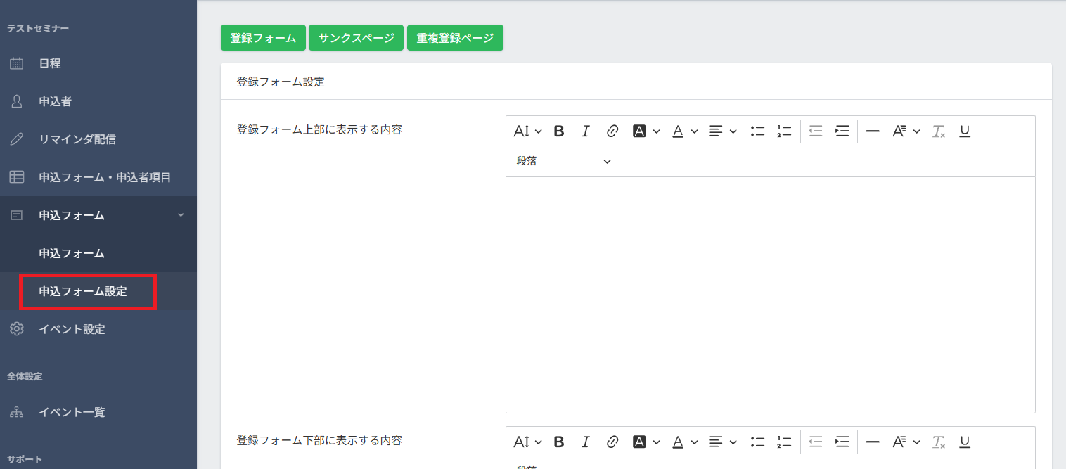 左メニュー【申込フォーム】>【申込フォーム設定】より以下の設定が可能です。
