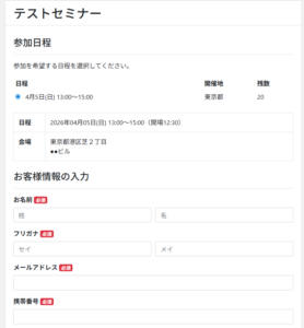 定員を設定した場合、申込みフォームに残席数の表示も可能です。