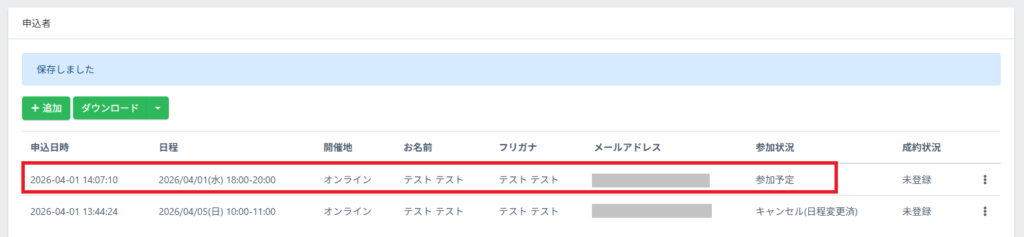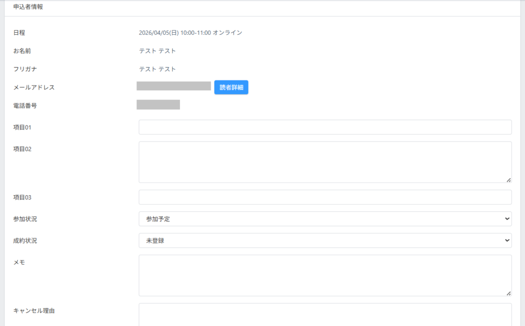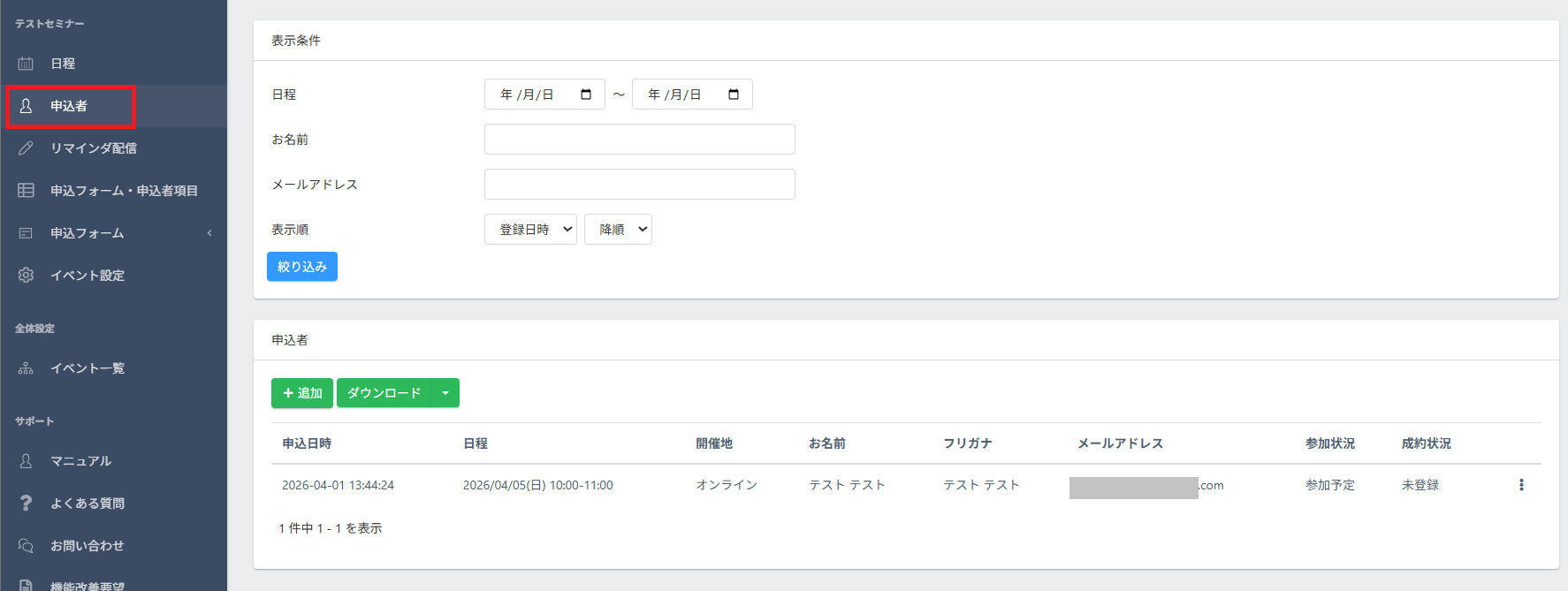 イベントに予約が入ると、左メニュー【申込者】へ申込者情報が表示されます。