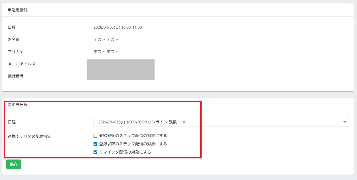 2.日程変更画面で【変更先日程】【連携シナリオの配信設定】を行い保存