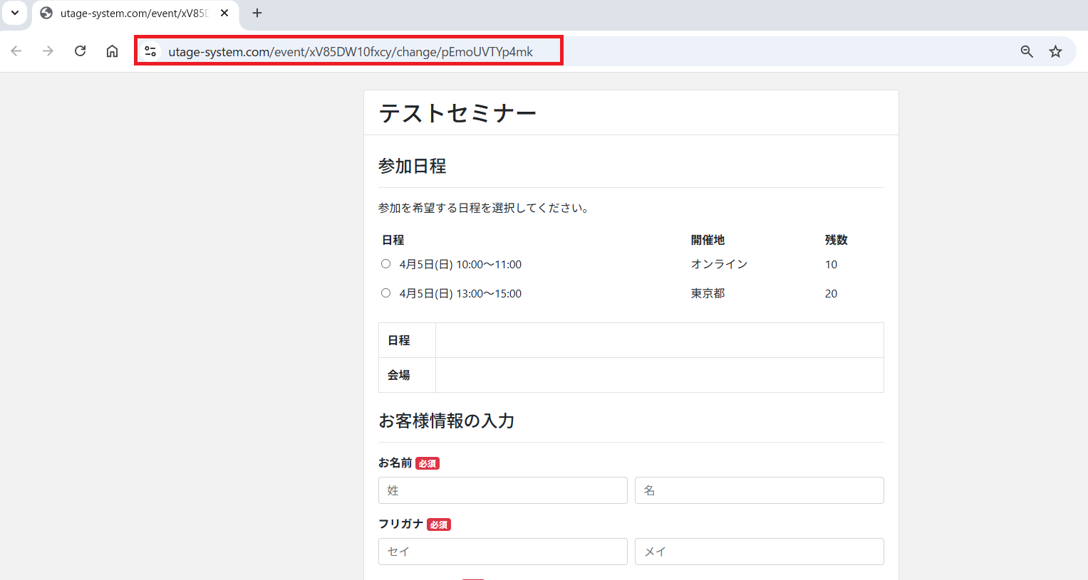 ※日程変更ページのURLは申込者個々に紐づいているため、