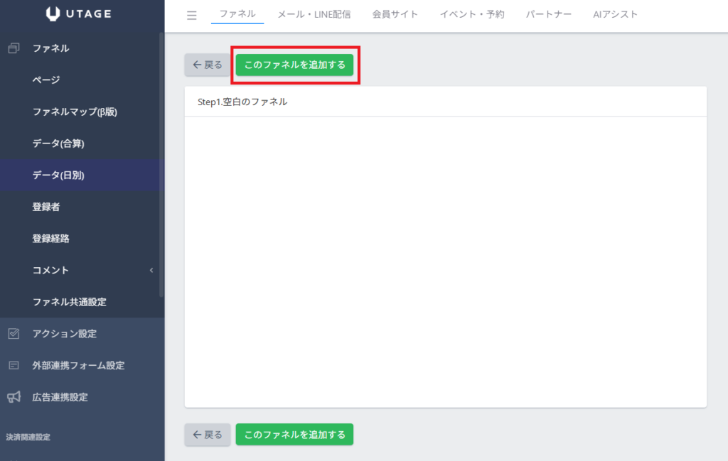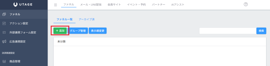 1.ファネル > ファネル一覧の「+追加」ボタンをクリックします。