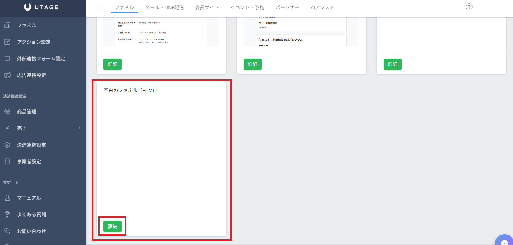 2.テンプレート一覧より【空白のファネル(HTML)】の「詳細」をクリックします。