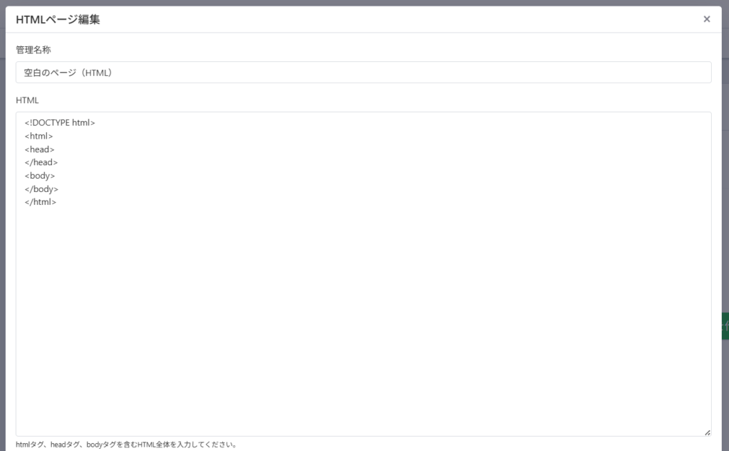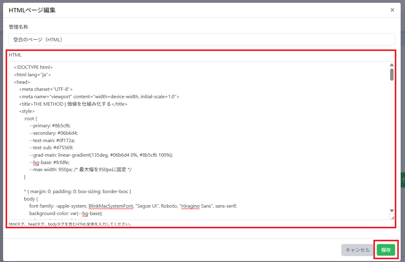 7.【HTML】欄にコードを貼り付け(記述)して保存します。【管理名称】も設定可能です。