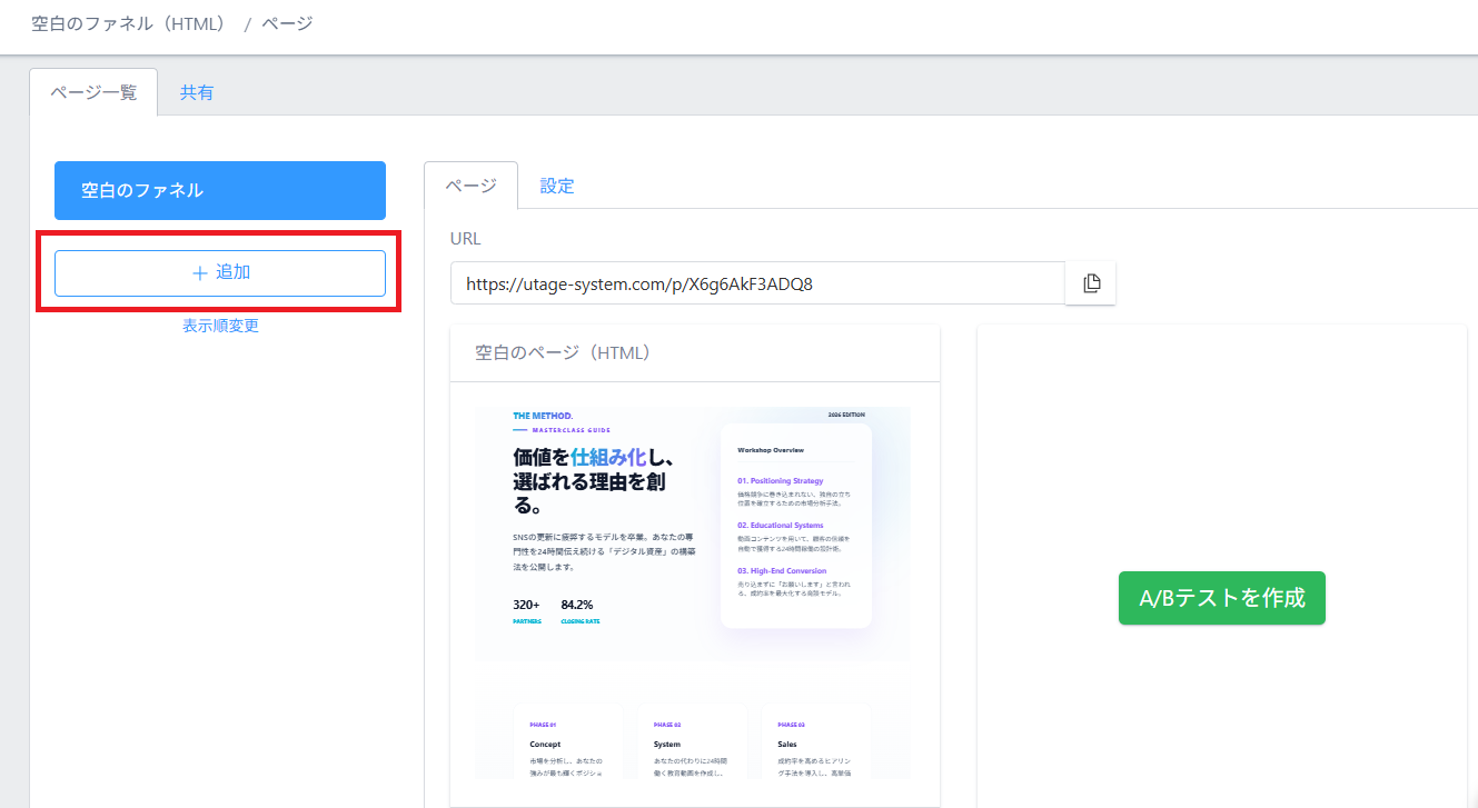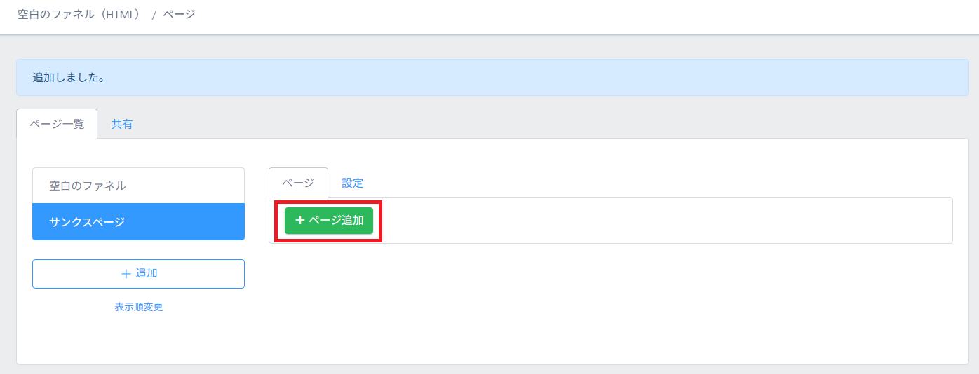 1.該当ファネルのページ一覧にて「+追加」をクリックします。