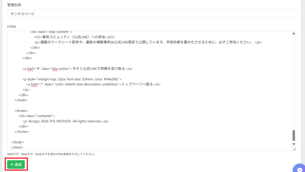 5.【管理名称】や【HTML】欄を入力して「+追加」をクリックします。