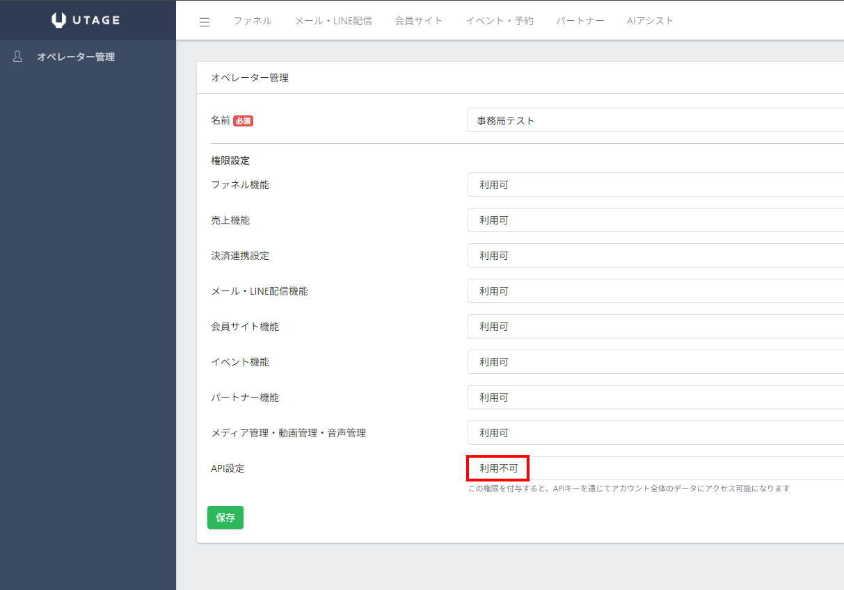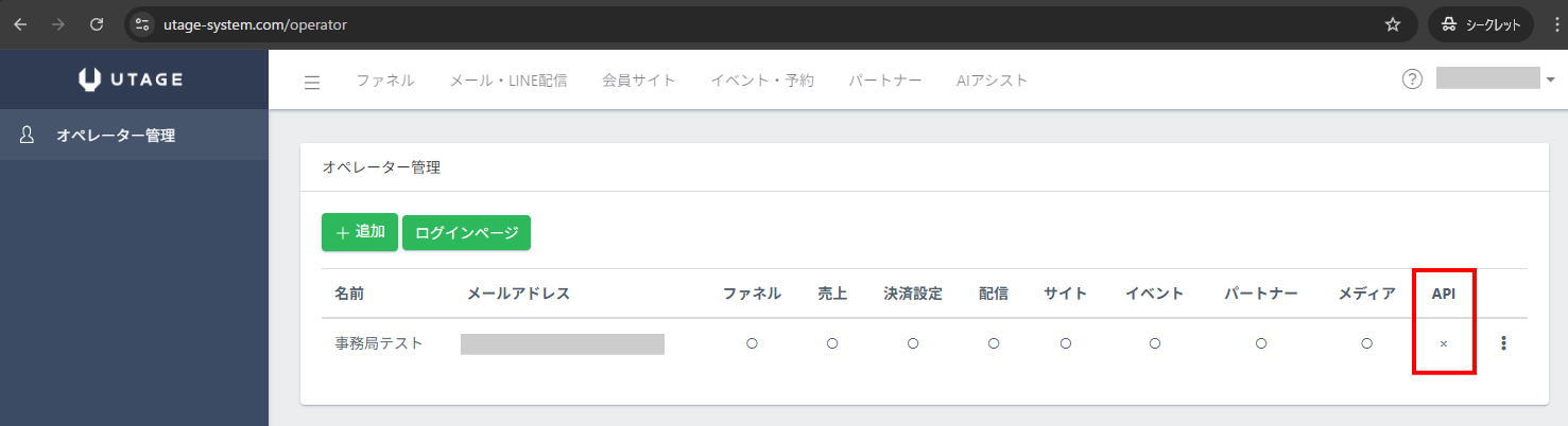 オペレーターアカウントでのMCP認証を通すためには、UTAGE契約者アカウントの「オペレーター管理」画面より、API権限を該当のオペレーターアカウントに付与する必要があります。