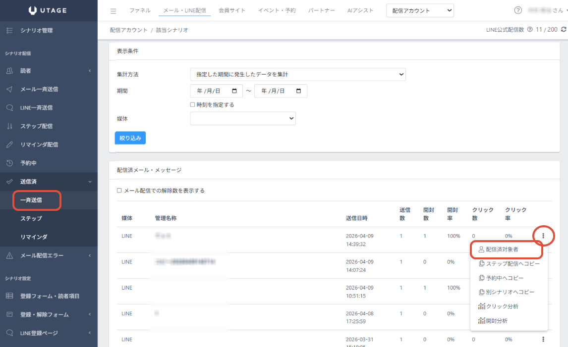 メール・LINE配信 >該当の配信アカウント >該当シナリオ >